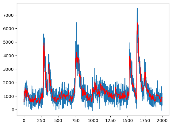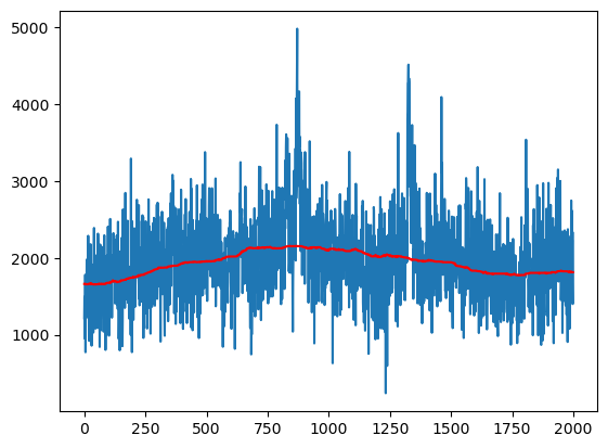 plt.plot(F0, color='r')Exercise: Use moving median window to estimate baseline activity of Cell 1 with a very small window size.