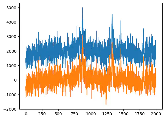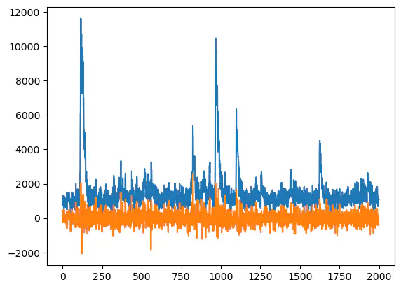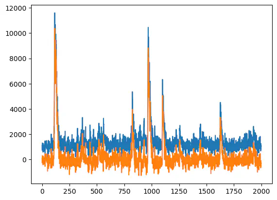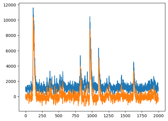 plt.plot(F_corr)Exercise: Subtract neuropil trace from Cell 2 calcium trace with a scaling factor of 0.7.