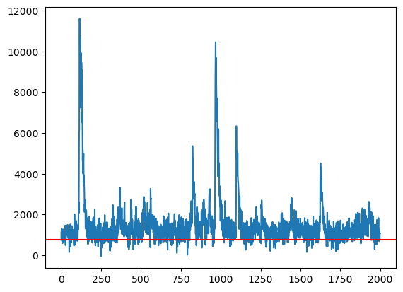plt.axhline(F0, color='r')Exercise: Plot median baseline activity of Cell 2.