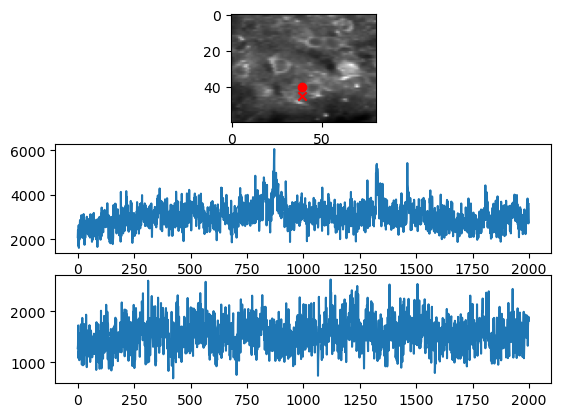 In this section, let us look at the brightness (fluorescence) of a single pixel over time. This brightness changes when calcium levels in the cell change which is an indicator that the neuron is “active”. Plotting how the fluorescence changes shows us when “activity” might have happened in that pixel.