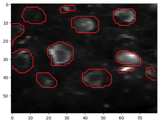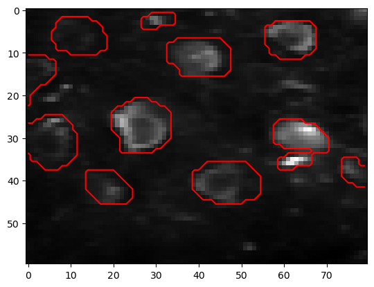 plt.contour(mask, colors='r')Exercise: Access second neuron and plot it here.