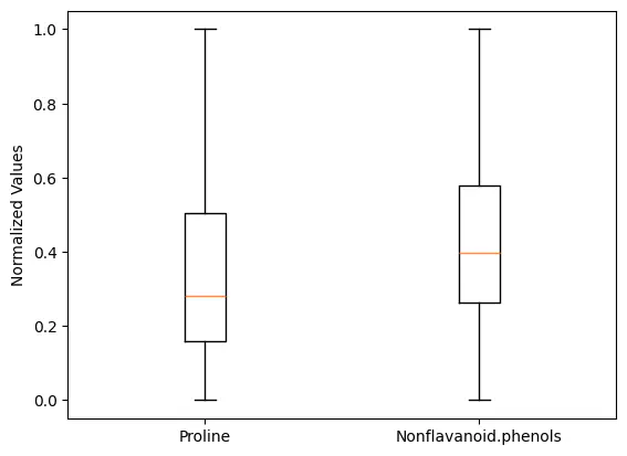 plt.ylabel('Normalized Values')Exercise: Compute the normalized values of the array features provided below, which contains the data from all columns except the Wine column. Assign the result to a variable named norm_features.