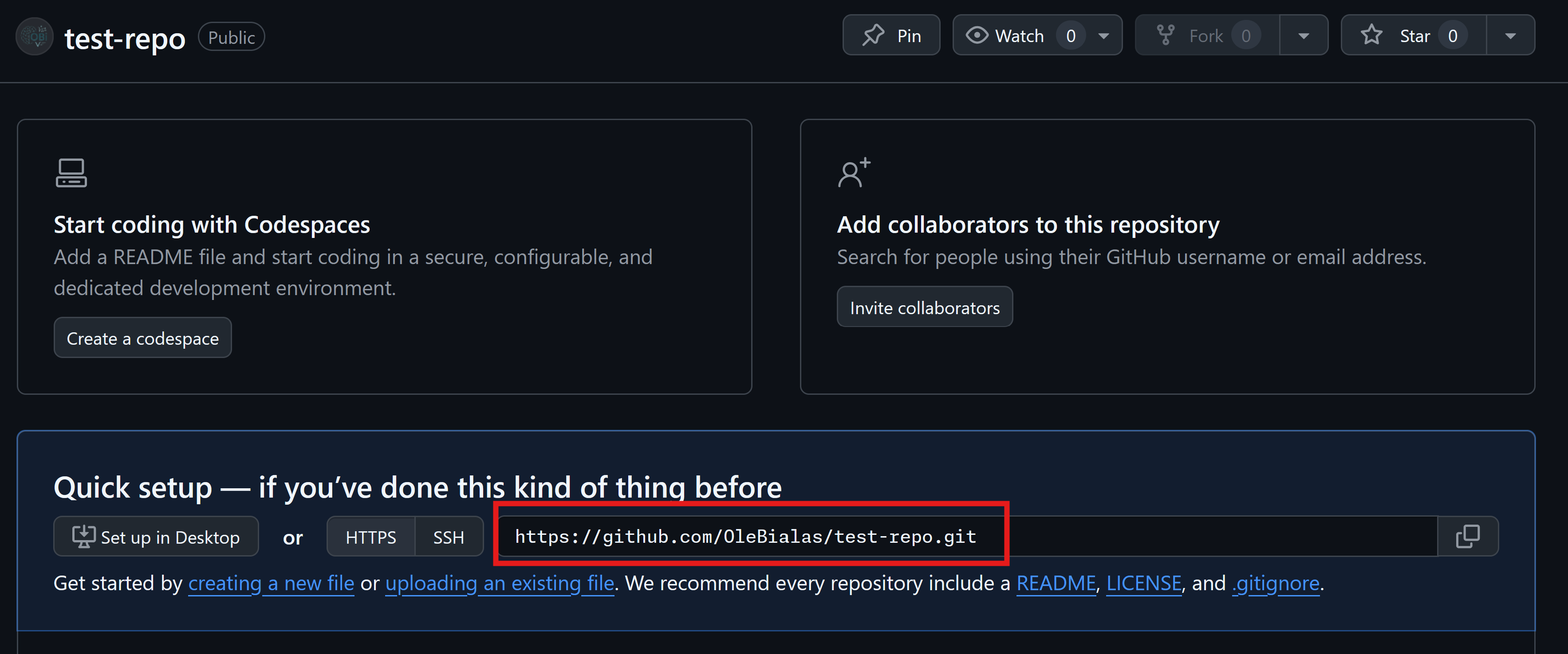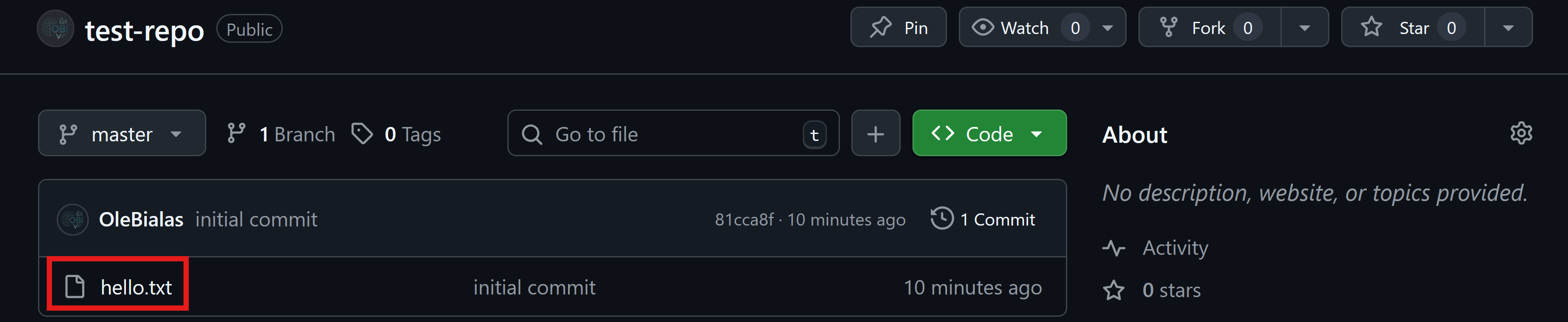 git remote add origin https://github.com/OleBialas/test-repo.gitExercise: Push the local repository to GitHub using git push -u origin main or git push -u origin master and authenticate yourself when you are prompted.