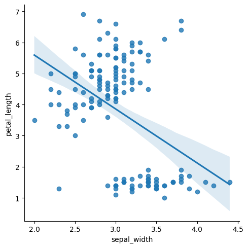 sns.lmplot(data=flowers, x='sepal_width', y = 'petal_length')Exercise: This time factor in the species variable into the lmplot() visualization. What kind of relationship do you see between sepal_width and petal_length now?