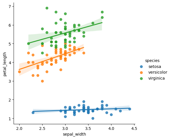 Exercise: Use seaborn’s lmplot() function to plot a regression line showing the sepal widths and petal lengths. Does the direction of this line match the results? Looking closely at the data’s distribution, what is missing from this story?