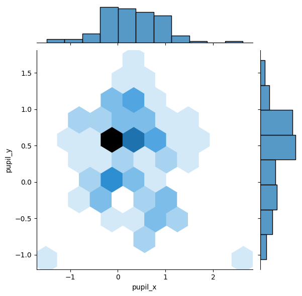 sns.jointplot(rdf, x='pupil_x', y='pupil_y', kind='hex')Section 5: Further Reading