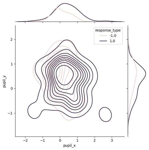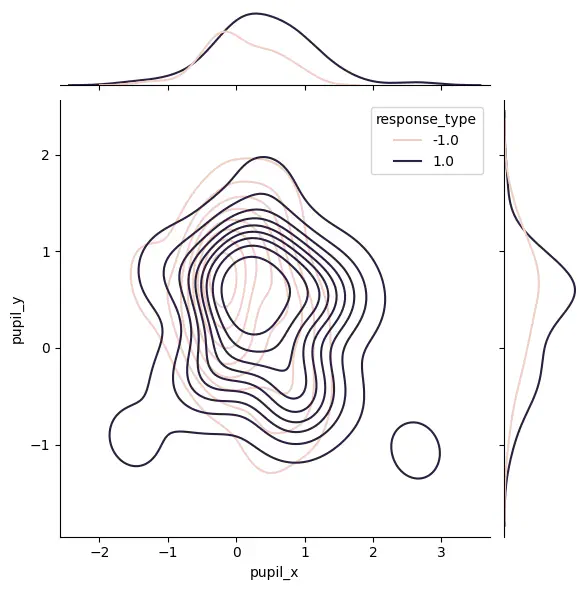 sns.jointplot(rdf, x='pupil_x', y='pupil_y', kind = 'kde', hue='response_type')Exercise: Make a joint plot comparing the pupil_x and pupil_y variables, using kind='hex'.