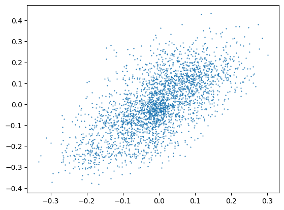 plt.scatter(csd_trialA, csd_trialB, marker='.', s=1.5);