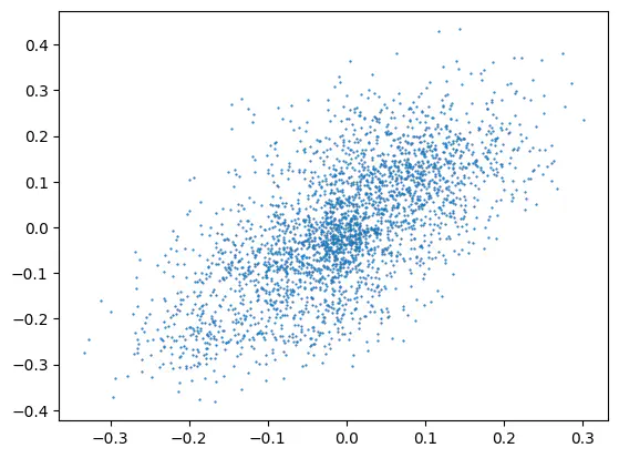 plt.scatter(csd_trialA, csd_trialB, marker='.', s=1.5);Exercise: Calculate and display the correlation between the CSD from trial 20 and trial 21.