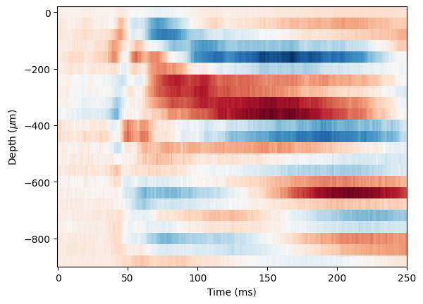 a = [ 2.213 ]Exercise: Plot the trial averaged CSD in the first 250 ms after stimulus onset using plt.pcolormesh function. Pass the time points that the LFP was sampled as the first parameter and the depth of channels (channels_depth) as the second parameter to the pcolormesh function.