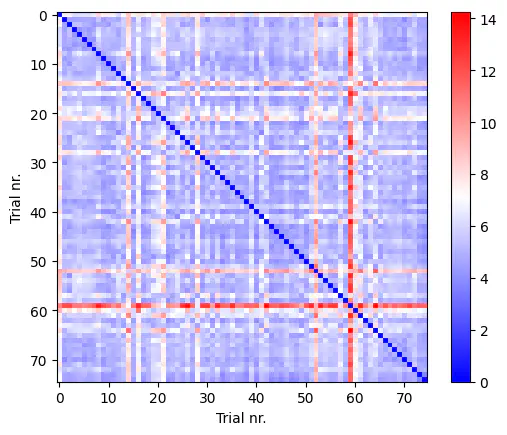 np.linalg.norm(csd_trialA - csd_trialB)7.175334725036059Exercise: Calculate and plot the pairwise euclidian distance between the the CSD from all trials.