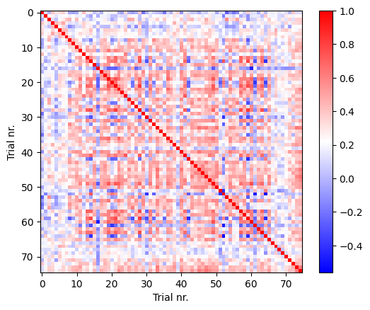 pearsonr(csd_trialA, csd_trialB)PearsonRResult(statistic=0.6614942496566328, pvalue=0.0)Exercise: Calculate the correlation between the CSD from trial 0 and the last trial (set itrialB to 74).