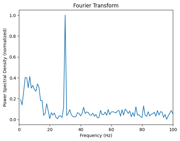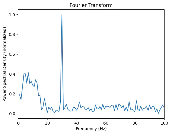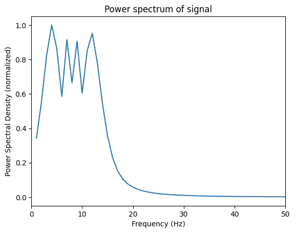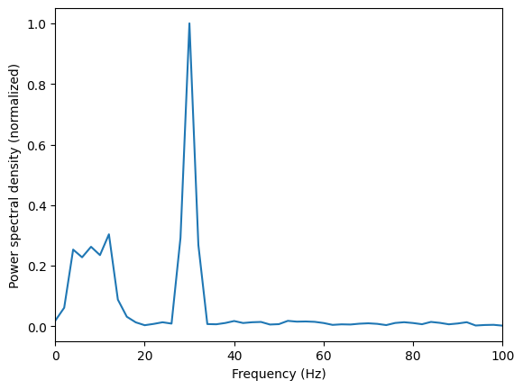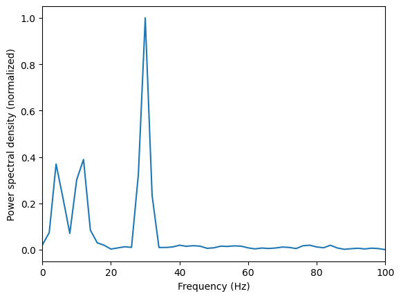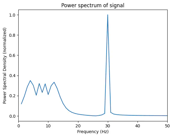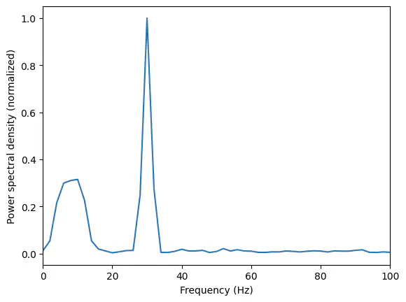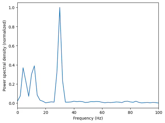 plt.ylabel('Power spectral density (normalized)');Exercise: Use Welch’s method to calculate the frequency spectrum for the composite signal generated below consisting of a sine wave with frequency 30 Hz, a chirp signal starting at 1 Hz and increasing to 15 Hz, and noise. Plot the result.