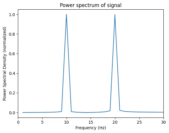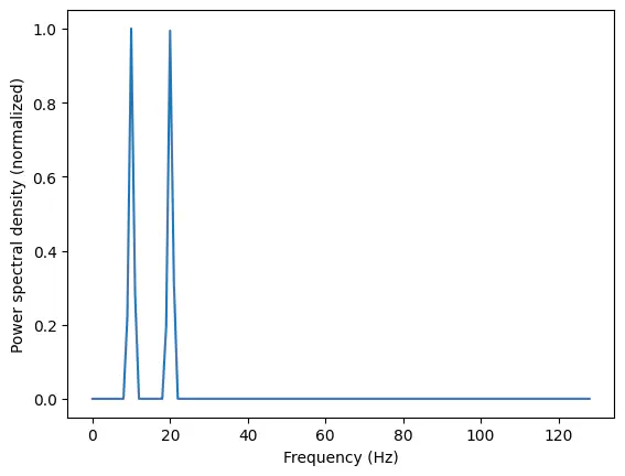 plt.ylabel('Power spectral density (normalized)');Exercise: Use Welch’s method to calculate the frequency spectrum for the composite signal below consisting of two sine waves with frequencies 10 Hz and 20 Hz and . Plot the result.