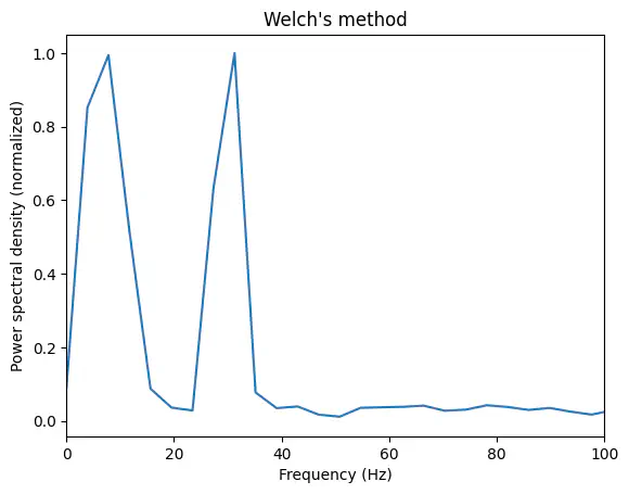 plt.xlim([0,100]);The nperseg parameter sets the size of the segment of the signal that each frequency spectrum is calculated for in Welch’s method. If the signal contains 1000 samples, and the nperseg is 500 (and there’s no overlap between segments1), you will have 2 segments of length 500 for which the spectrum is calculated, and the final spectrum is the average of the spectra for those 2 segments. If the signals contains 1000 samples and nperseg is 50, then you’ll have 20 segments, and the final spectrum is the average of those 20 individual spectra.
