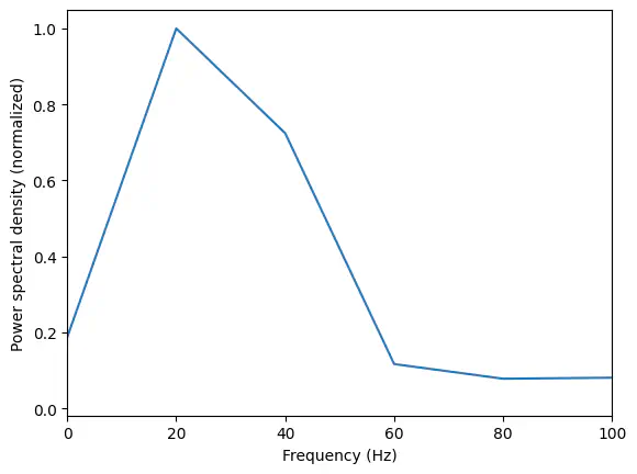 plt.xlim([0,100]);Exercise: Calculate and plot the spectrum again using Welch’s method on the same signal, but this time, set the parameter nperseg to 50 (nperseg = 50) inside the welch function. Can you still tell the peaks of the two original signals that make up the composite signal apart?