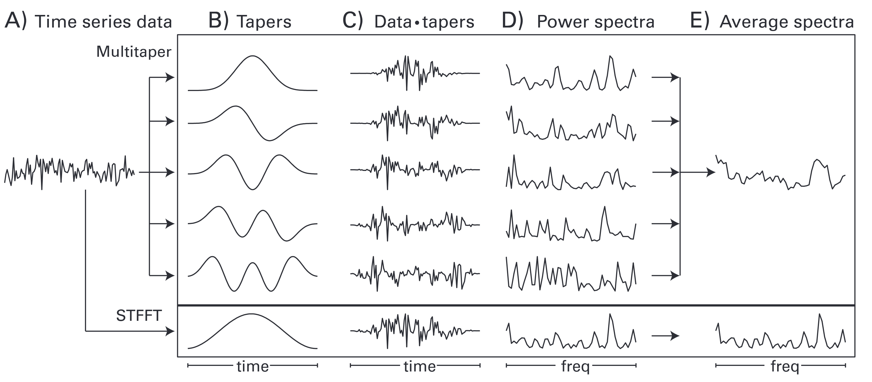 Similar to Welch’s method, multitapering is also based on averaging across multiple spectra, though the method for calculating the individual spectra is slightly different. With multitapering, your signal is multiplied with different “tapers”, as they are called (ilustrated in panel B in the figure below). The Fourier transform is calculated for each of the differently tapered signals to get a collection of power spectra. In the end, these individual power spectra are averaged to produce the total power spectrum (panel E).