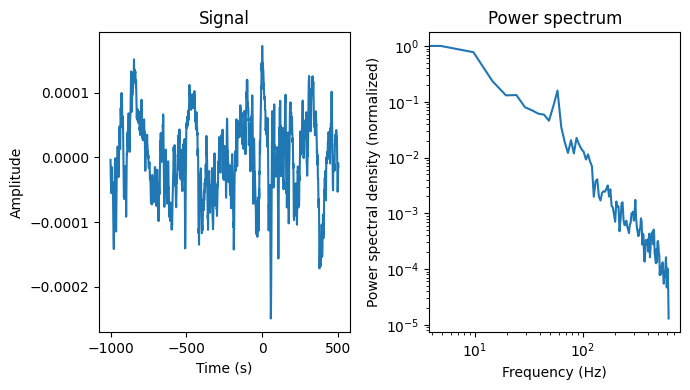 ax[1].set(xlabel = 'Frequency (Hz)', ylabel = 'Power spectral density (normalized)', title = 'Power spectrum')
