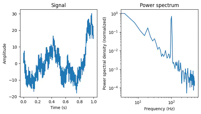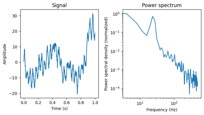 plot_signal_and_power_spectrum(time_vec, sig, freqs, psd_signal_norm)Solution