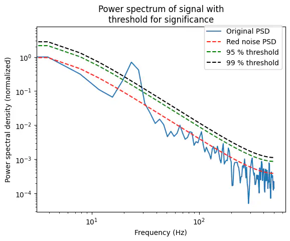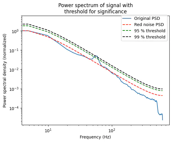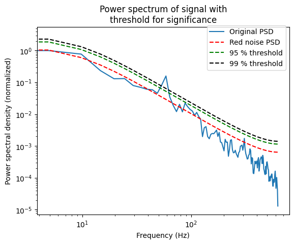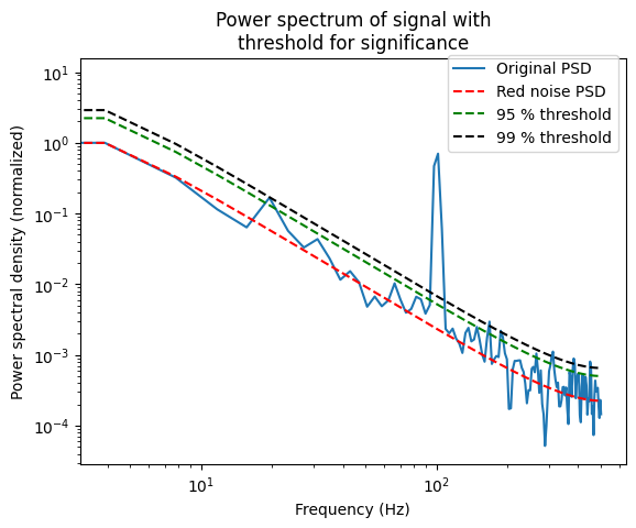psd_expected, psd_significance_threshold = utils.get_significance_threshold_psd(red_noise_spectrum, freqs, psd_lfp_trace_norm, n_samples, n_perseg,)
