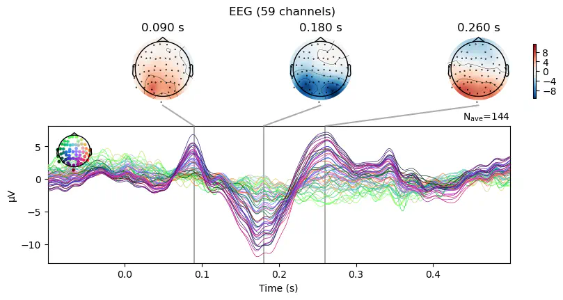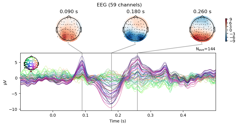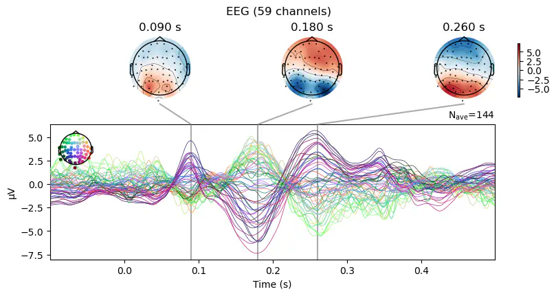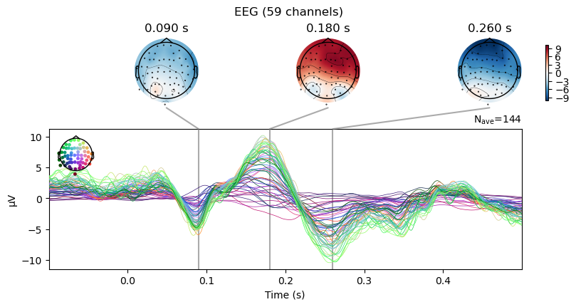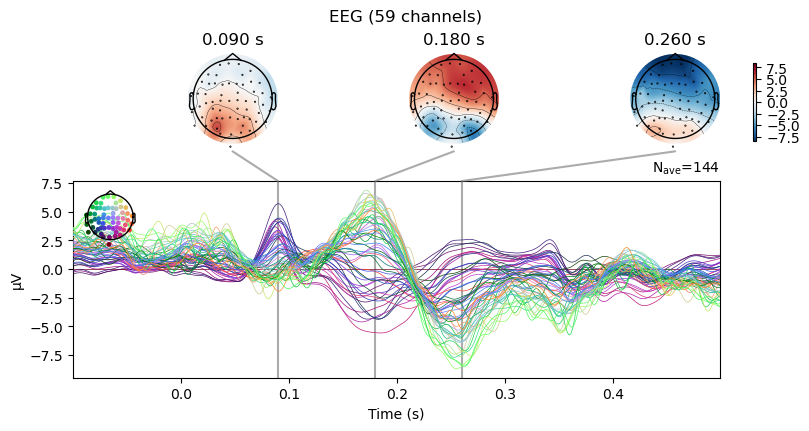 erp.plot_joint(times=[0.09, 0.18, 0.26]);No projector specified for this dataset. Please consider the method self.add_proj.Exercise: Use .set_eeg_reference() to reference the recording to the "average" of all channels. Then, re-compute the ERP and visualize it with .plot_joint() using the same times as before. Compare the topographical voltage distributions to the previous plot.