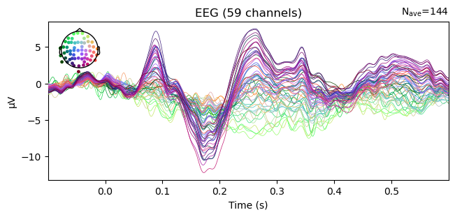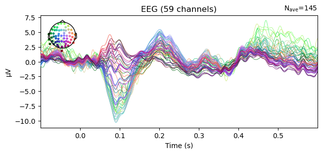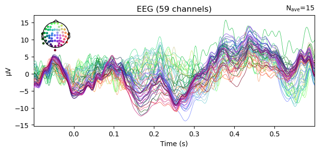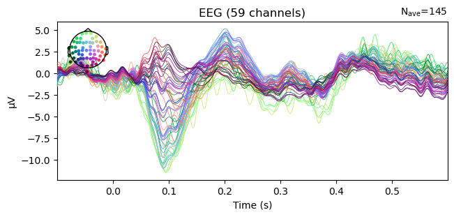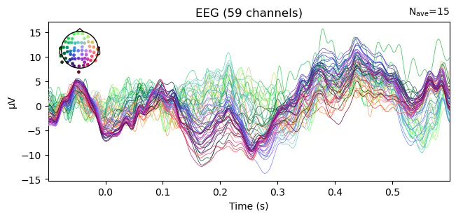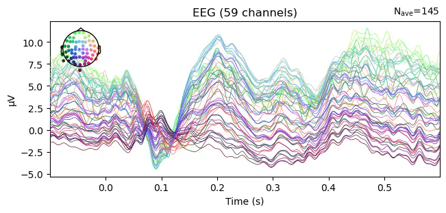 Using data from preloaded Raw for 5 events and 421 original time points ...Example: Average all "visual" epochs and .plot() the ERP. The colors represent the channel locations, shown on the scalp map in the top left corner of the plot.