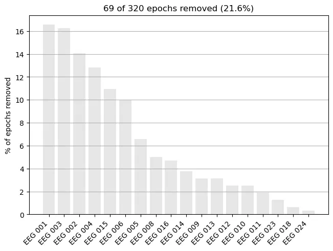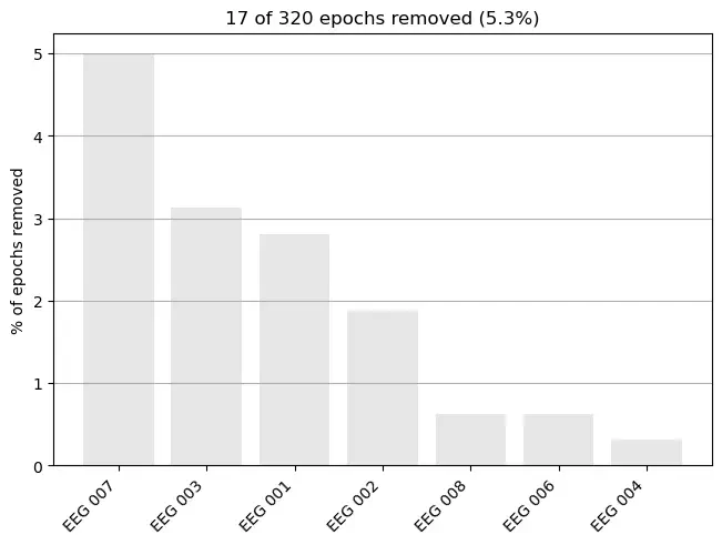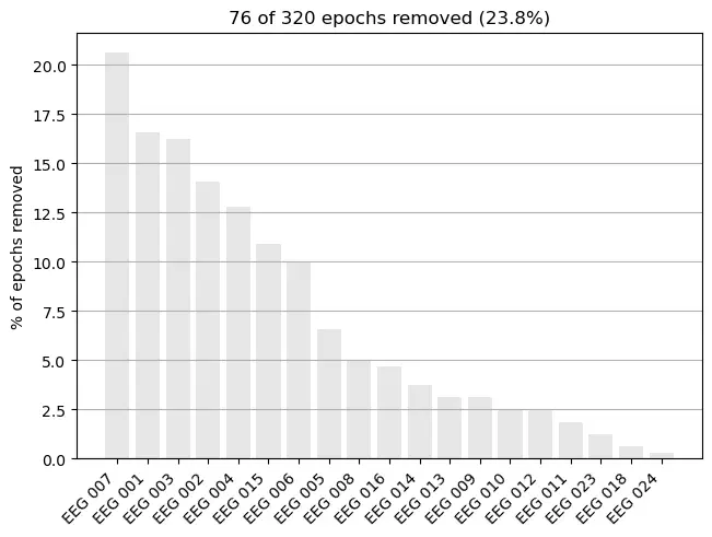 combining channels using "mean"Example: To remove outlier epochs, define a dictionary of reject_criteria to reject epochs with a peak-to-peak amplitude above (i.e. 150e-6 ). Then, copy the epochs, apply the rejection criteria and use .plot_drop_log() to see which channels are responsible for the dropped epochs.