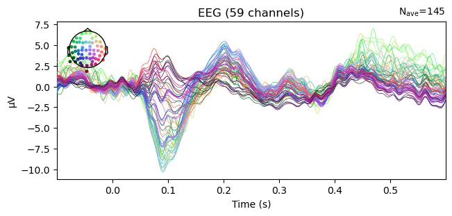epochs = mne.epochs.Epochs(raw, events, event_id, tmin=-0.1, tmax=0.6, baseline=None)
