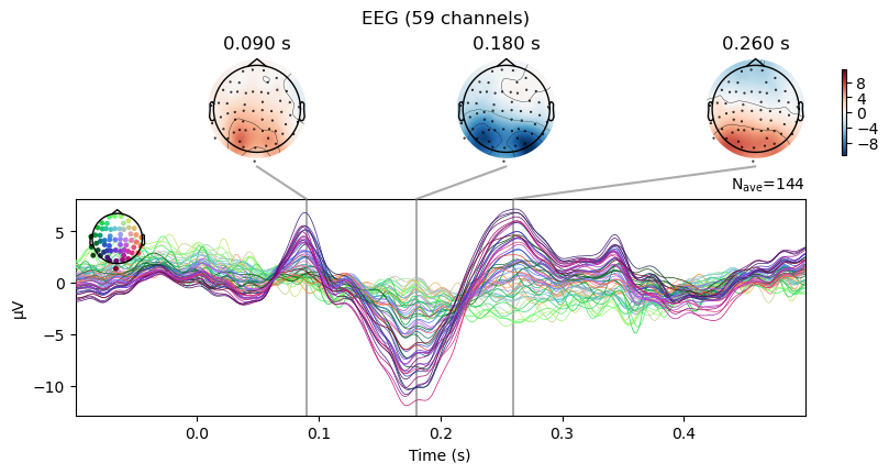 erp.plot_joint(times=[0.09, 0.18, 0.26]);EEG channel type selected for re-referencing