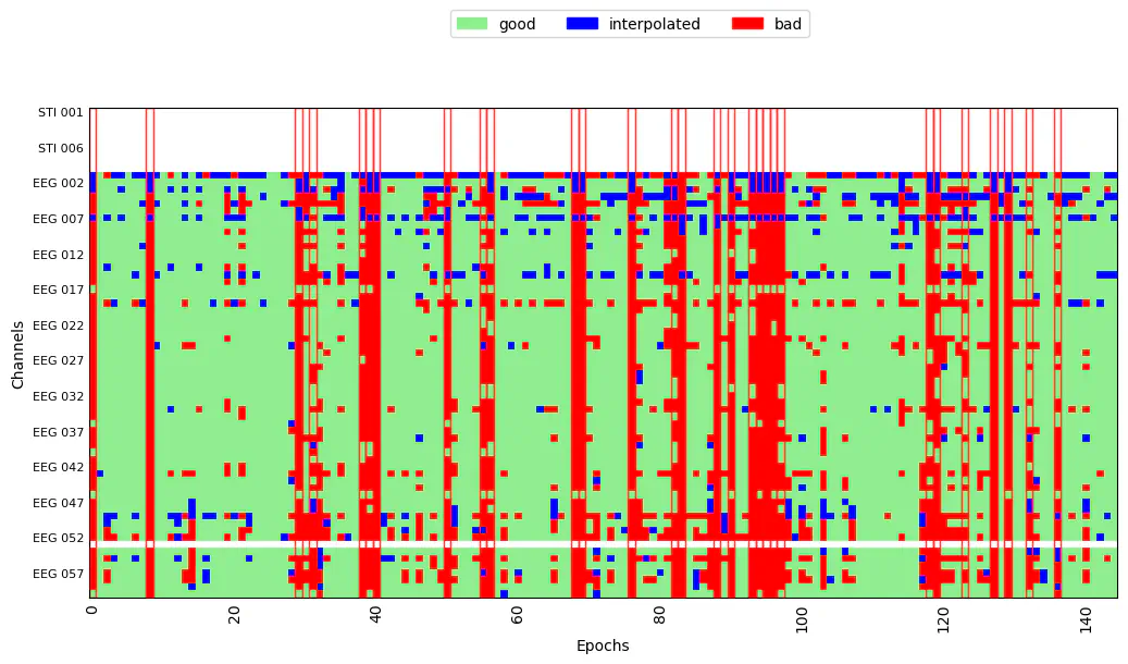 epochs_clean, reject_log = ar.fit_transform(epochs, return_log=True)Dropped 29 epochs: 0, 8, 29, 31, 38, 39, 40, 50, 55, 56, 68, 69, 76, 82, 83, 88, 90, 93, 94, 95, 96, 97, 118, 119, 123, 127, 129, 132, 136The drop log shows us what the algorithm actually did. Each row is one channel and each column is one epoch. Channels marked blue have been interpolated in the given epoch, and epochs marked red have been dropped.