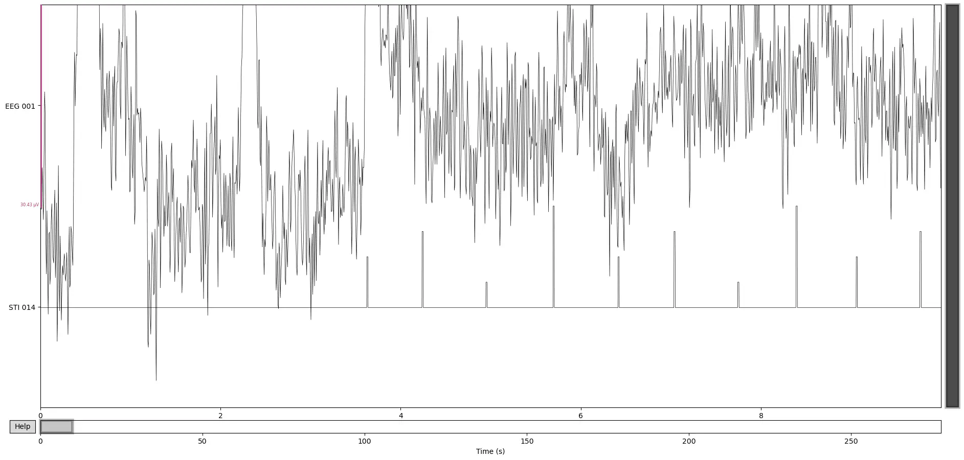 Events can be encoded in dedicated stimulus channels of the EEG. The code below plots a single EEG channel along with the stimulus channel "STI 014". The latter contains impulses whose height encodes the type of event.