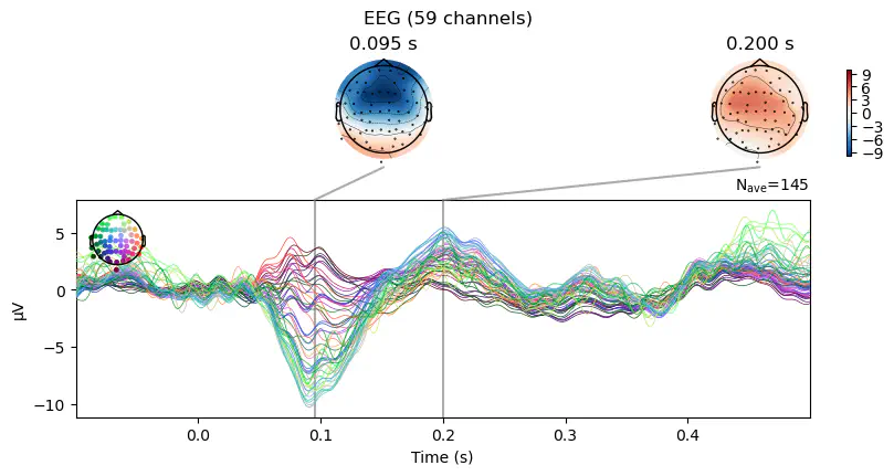 erp.plot_joint(times=[0.095, 0.2]);No projector specified for this dataset. Please consider the method self.add_proj.Exercise: Compute the "visual" ERP and use the .plot_joint() method to visualize it along with the topographical distribution of voltage at [0.09, 0.18, 0.26] seconds.