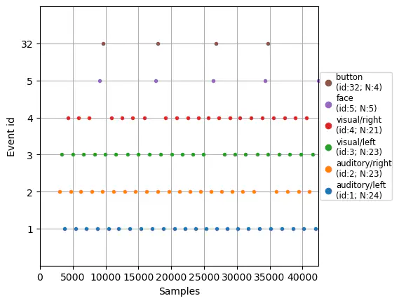 mne.viz.plot_events(events[:100], first_samp=25000, event_id=event_id);Example: Merge the events 3 and 4 (i.e. the left and right visual stimuli), encode the merged event with the number 34 and overwrite the existing events.