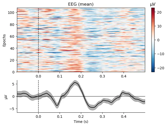 Applying a custom ('EEG',) reference.Example: Plot all "visual" epochs as an image. In the top panel, every row in the image represents a single epoch. The bottom panel shows the mean across channels averaged across all epochs. Can you spot outlier epochs where the amplitude is particularly high?