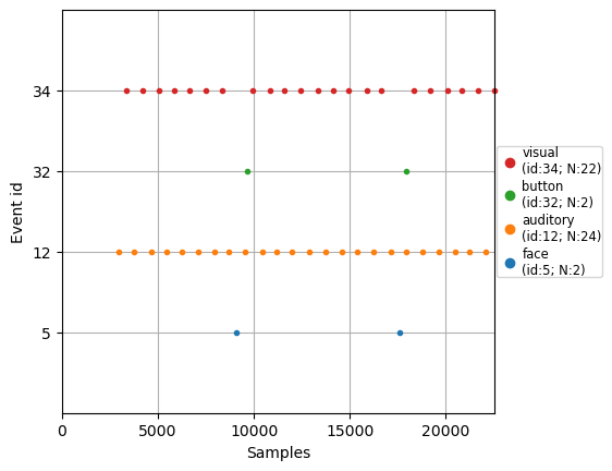 mne.viz.plot_events(events, first_samp=raw.first_samp, event_id=event_id) |
