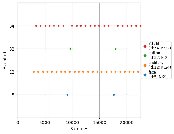 mne.viz.plot_events(events[:50], first_samp=25000, event_id=event_id);Section 2: Epoching Continuous EEG Data