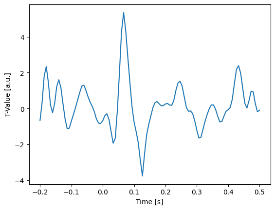 The code below tests the difference between the "auditory/left" and "auditory/right" conditions at the right temporal channel "MEG 1441" and plots the t-values while highlighting all samples where the uncorrected p-value is smaller than 0.05.