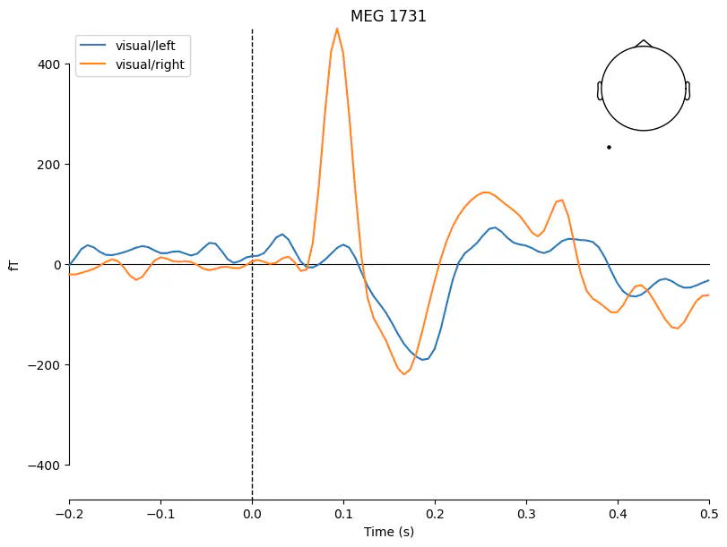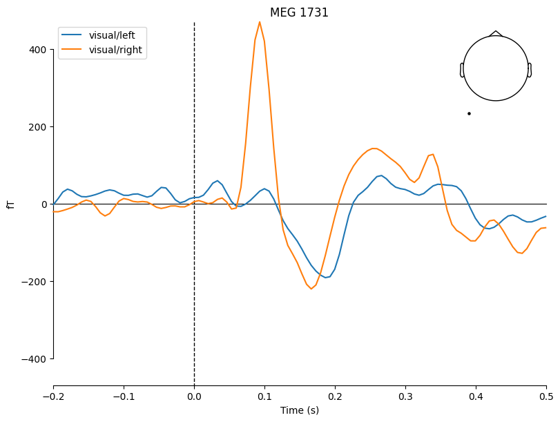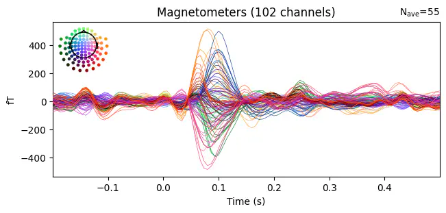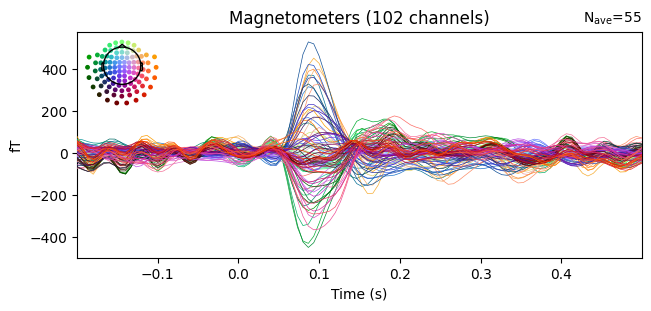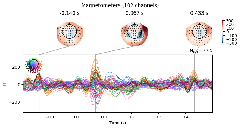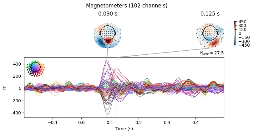 'visual/right': <Evoked | 'visual/right' (average, N=55), -0.1998 – 0.49949 s, baseline off, 102 ch, ~3.1 MiB>}Example: Use the combine_evoked() function with weights=[1, -1] to subtract the ERFs for the "auditory/left" and "auditory/right" conditions and use the .plot_joint() method to visualize the difference.