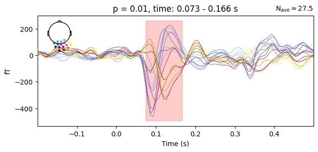 utils.plot_cluster_topo(clusters[idx], t, p[idx], epochs)Example: Get the index of the cluster with the smallest p-value, compute the difference ERF between the "auditory/left" and "auditory/right" conditions and visualize it using utils.plot_cluster_channels() which marks the temporal extent of the cluster.