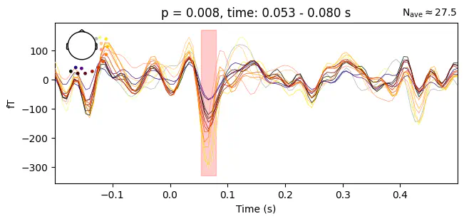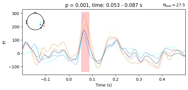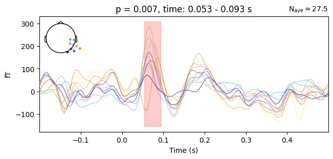 Found 8 clustersExercise: Use utils.plot_cluster_topo and utils.plot_cluster_channels again to visualize the spatial and temporal extent of the cluster with the second lowest p-value. How does it compare to the previous cluster?