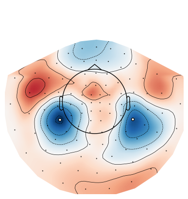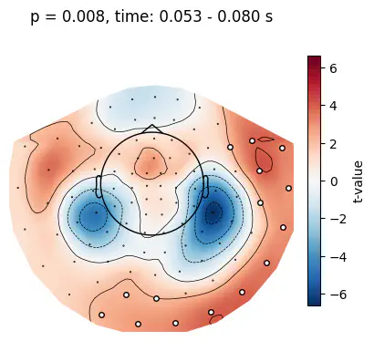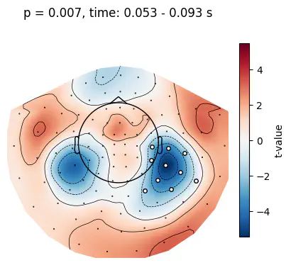 Found 37 clustersnp.float64(0.007)Example: Get the index of the cluster with the smallest p-value and visualize the cluster using the utils.plot_cluster_topo() function. The topographical plot shows the t-value of each channel, averaged across the cluster duration.