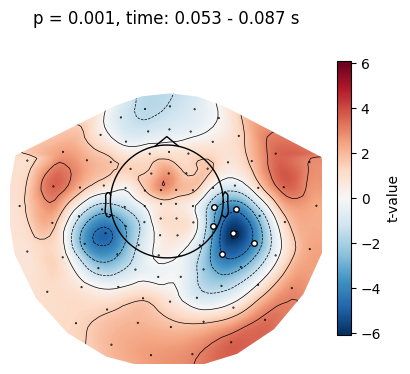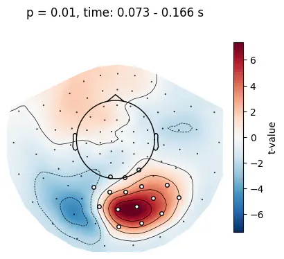 utils.plot_cluster_channels(clusters[idx], p[idx], diff)The t-value threshold determines the spatial and temporal sensitivity of the cluster test. With a lower threshold, the sensitivity is higher but clusters are more spread out. Let’s increase the threshold to the t-value that corresponds to p_thresh=0.0001.