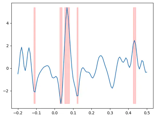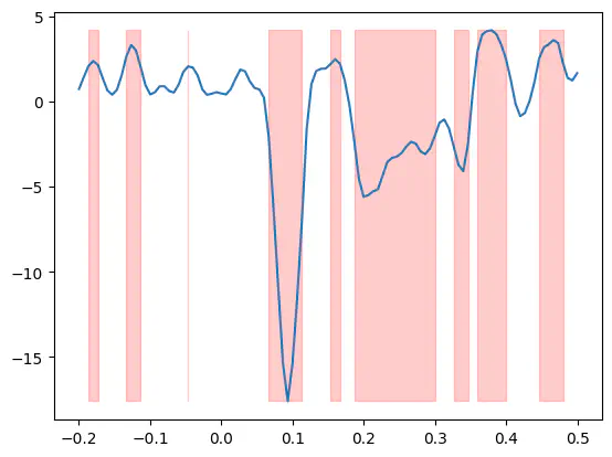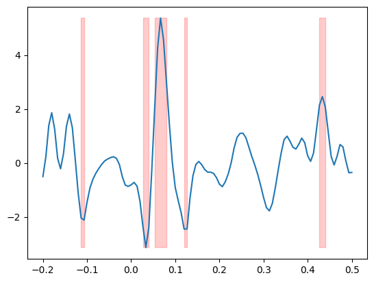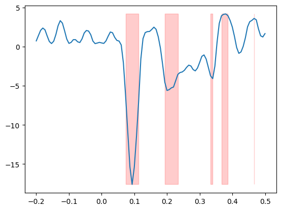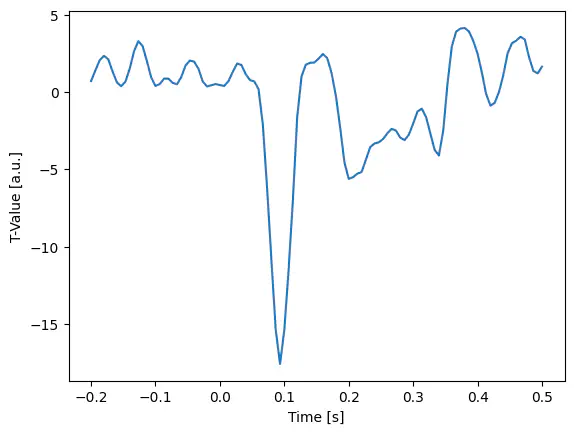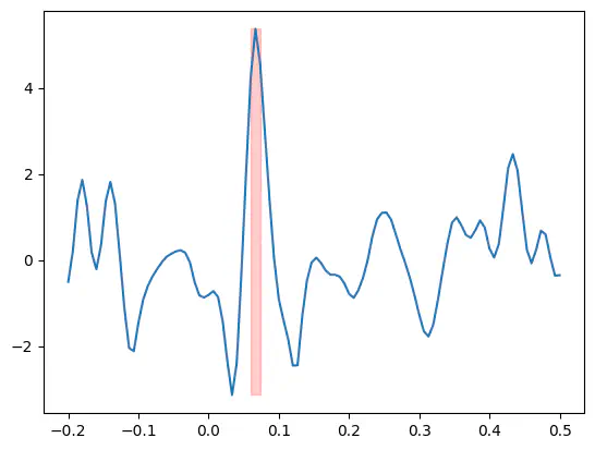 plt.fill_between(epochs.times, t.min(), t.max(), where=(p < p_thresh).any(axis=0), alpha=0.2, color="r")Exercise: Apply the bonferroni_correction to the p-values then plot the t-values and highlight all samples where the Bonferroni-corrected p-value is smaller than 0.05.