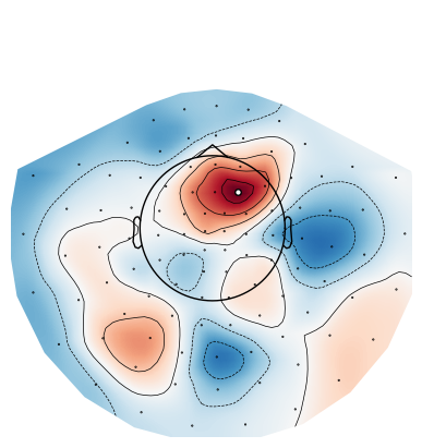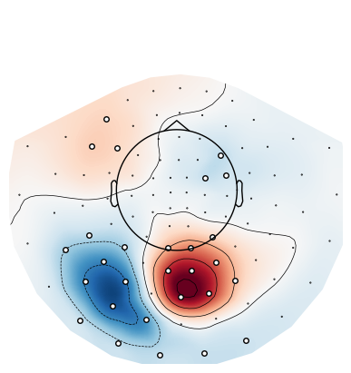 mne.viz.plot_topomap(t[:, idx], epochs.info, size=4, mask=p[:,idx]<p_thresh);Section 3: Correcting for Multiple Comparisons