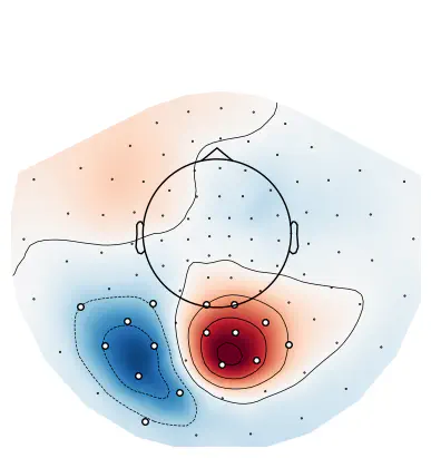utils.plot_cluster_channels(clusters[idx], p[idx], diff)Exercise: Get the index of the cluster with the second smallest p-value and visualize the difference ERF using utils.plot_cluster_channels().