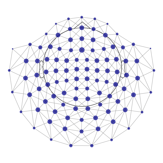 mne.viz.plot_ch_adjacency(epochs.info, adjacency, ch_names);Reading adjacency matrix for neuromag306mag.Finally, we need to set a t-value threshold: times and channels where the t-value exceeds the threshold will be grouped into clusters. Here, we choose the value from the t-distribution t_dist that corresponds to a p-value of p=0.01.
