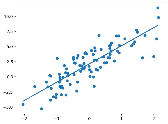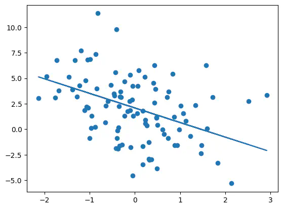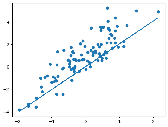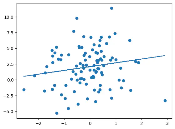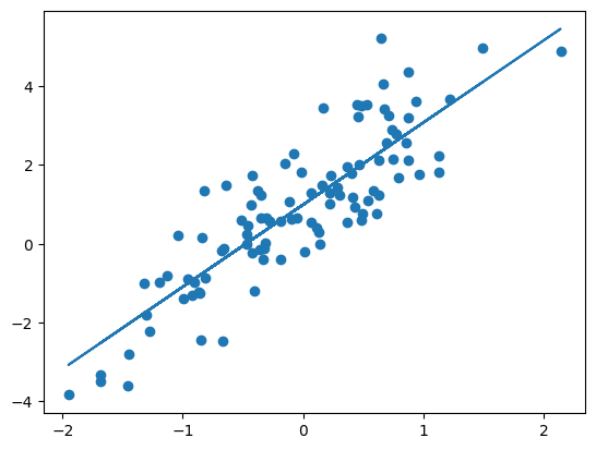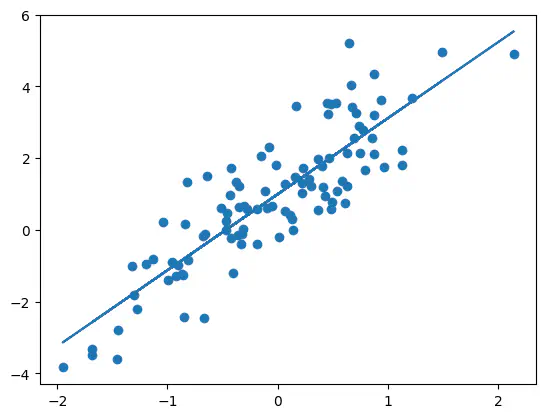 coefarray([ 2.08767734, 3.00559502, -1.43020719, 0.60250069])Example: Predict the relationship between and (X[:,0]) using the estimates for and (coef[[0, 1]]) and plot the original data together with the estimated relationship.