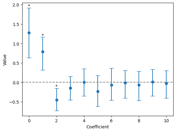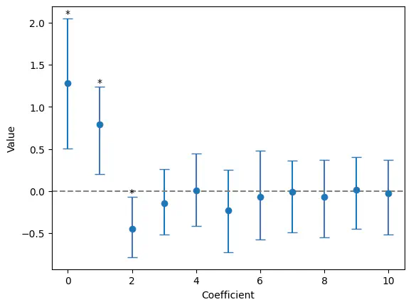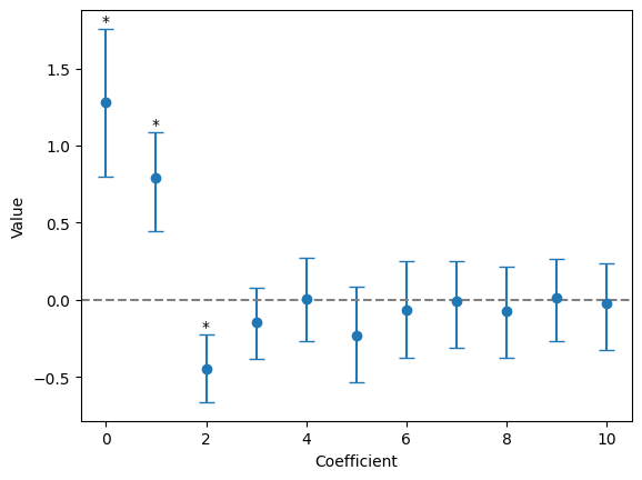 0.12867731, -0.17484593]], shape=(10000, 11))Example: Plot the mean value for each coefficient across all bootstrap resamples with a 95% confidence interval (CI). The asterisk indicates that the CI for the given coefficient does not include 0.
