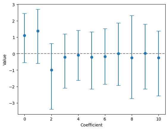 utils.plot_bootstrap_coefs(coefs, ci=95)Exercise: Plot the bootstrapped coefficients with a 99% and 99.9% CI. Which coefficients are significantly different from 0?