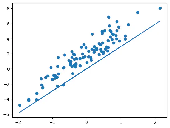 plt.plot(X, y_pred);Example: To fit an intercept, we prepend a column of np.ones() to X. The coefficient assigned to that column gets multiplied by 1 for every sample and thus acts as a constant offset.